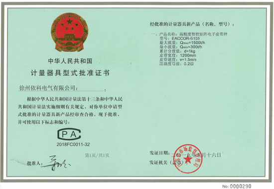 熱烈祝賀徐州依科電氣有限公司專利技術(shù)高精度智控矩陣電子皮帶秤EACCOR-B159獲得0國家0.2級計(jì)量證書CPA2018FC0011-32批準(zhǔn)證書,配套高精度矩陣傳感器及矩陣智能稱重控制器(采用SEQ-AI智能算法,矩陣控制跟蹤復(fù)核技術(shù),...